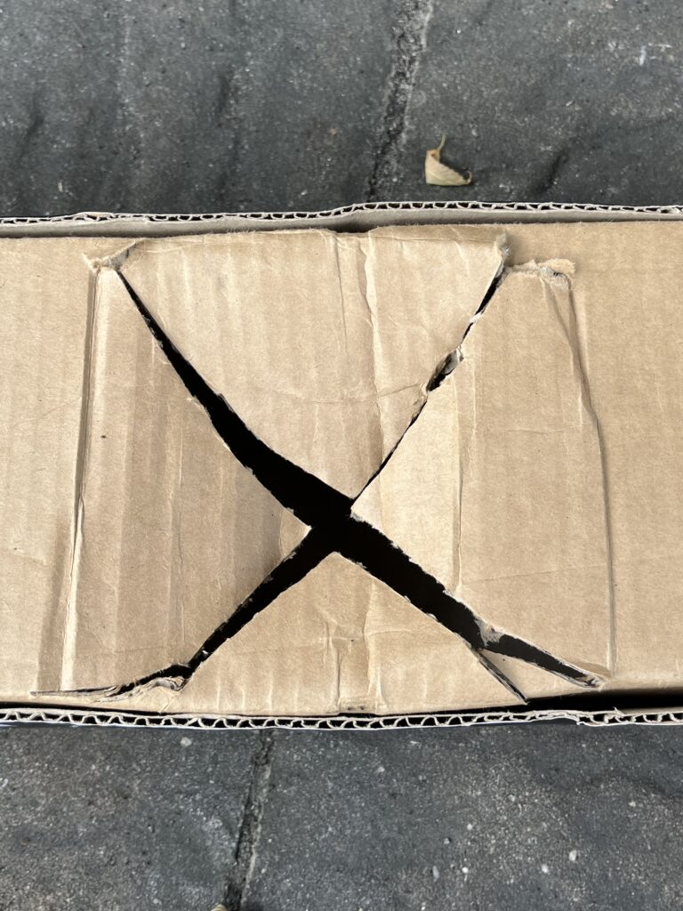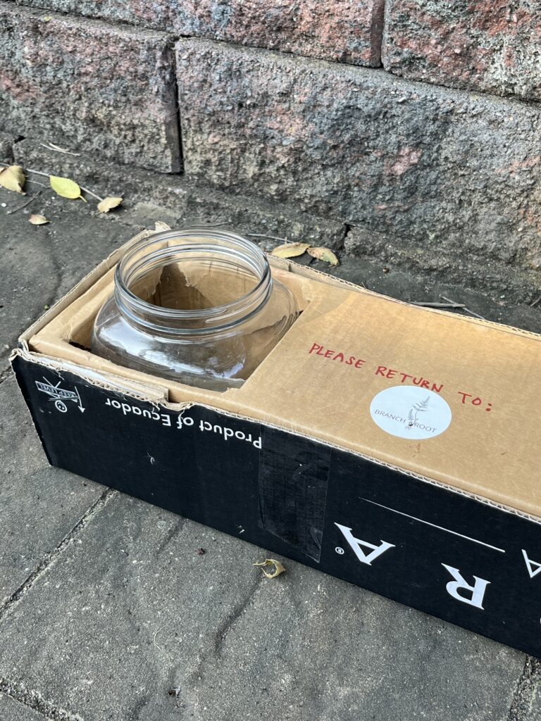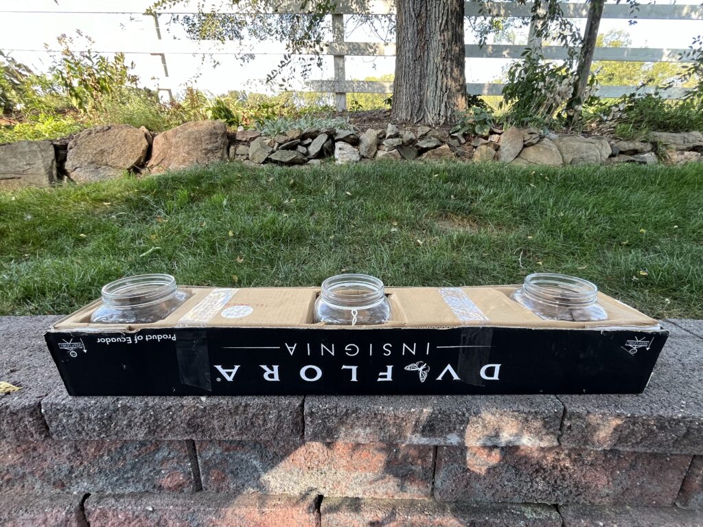 Using repurposed floral cardboard boxes, Glanette cuts an “X” into the top and inserts glass jars directly into the opening. The jars sit snugly in place, supported by the cardboard flaps, creating a stable base that prevents tipping.