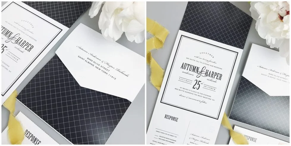 5. All-in-One Invitations – The Seal & Send wedding invitations are Basics Invite’s newest collection. They are all-in-one invitations with a tear off RSVP postcard included. They offer over 30 designs and, of course, these are also customizable. Because your guest’s address is already printed on the front of the invitation, no envelope is necessary. All you need to do is follow the steps above to gather your guest’s addresses and upload them onto your design. After receiving your order, just add postage, fold them and secure them with a sticker. So easy!