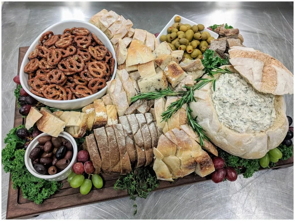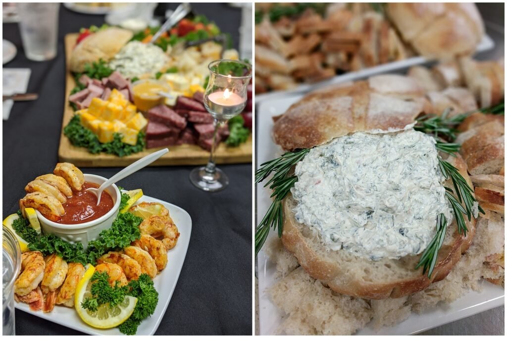 Spinach bowls with artisan breads. Meat and cheese platters. Veggie and dip platters. Charcuterie spreads and fruit spreads are beautiful, but they take an extreme amount of work to set up, and they also are very hard for the servers to keep filled up and looking nice. We also found that it takes people longer to file through a charcuterie spread than just meat and cheese platters that you can swap out or simple hors d’oeuvres. Also it’s very important that you can access both sides of an appetizer table.. Put identical things on both sides.